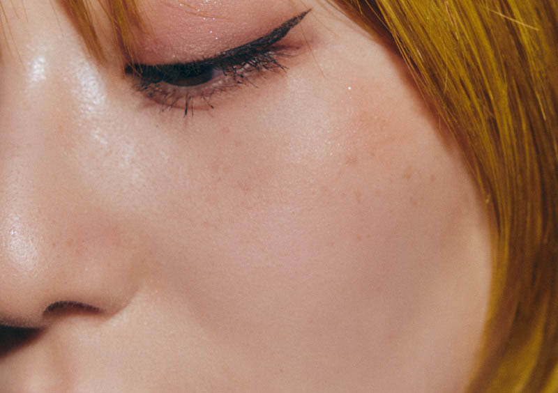 鼻筋を中心に、骨格の高い位置にハイライトを入れる。スリークなヘアスタイルに合わせ、肌もツヤのある質感に。