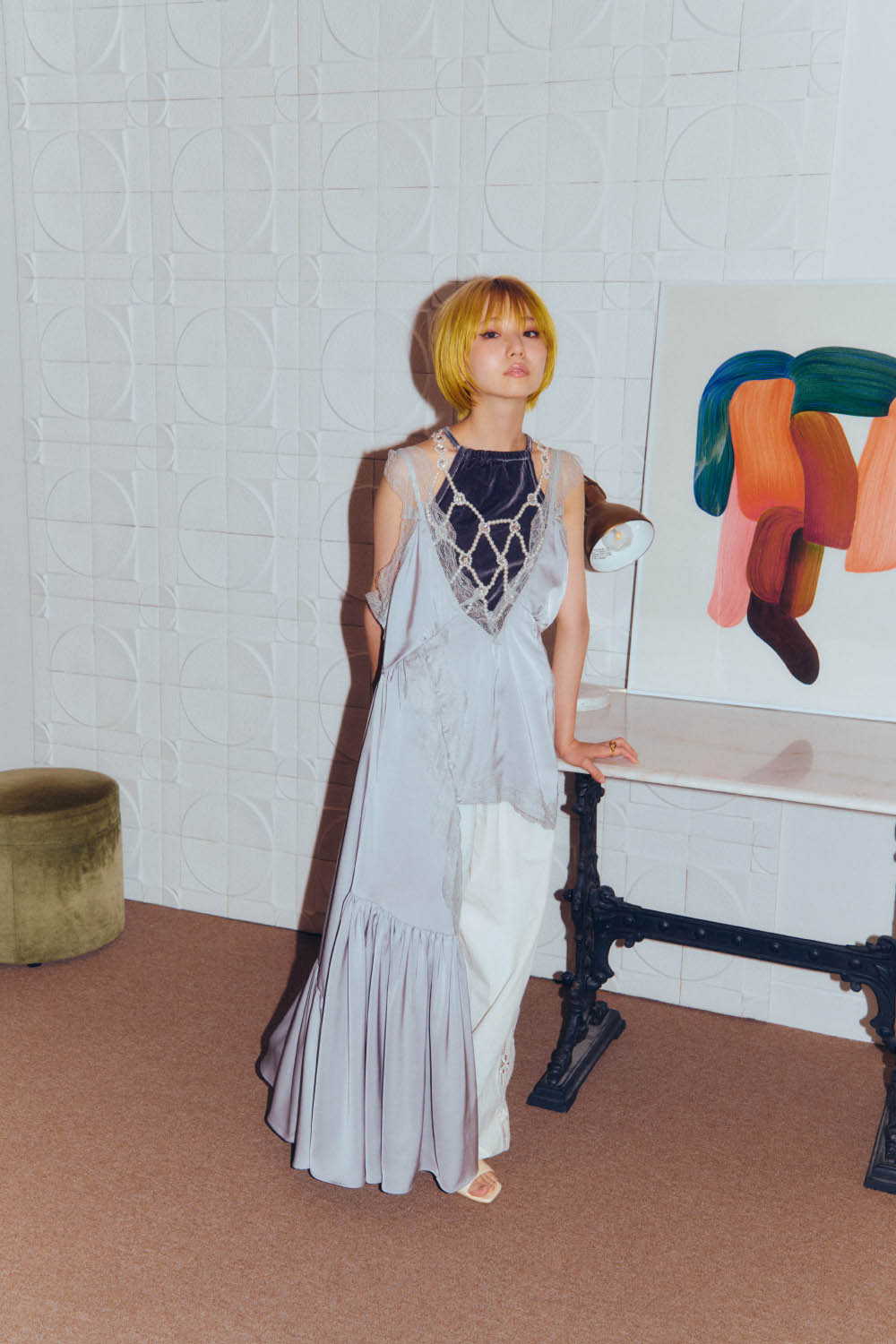ベロアのキャミソールに、パールの装飾がついたキャミソールをレイヤードし、さらにアシンメトリーなシルエットのワンピースをオン。パーティー感のある華やかな素材と複雑なレイヤードで、少しひねくれた、媚びない個性を表現した。そこにサイドレースの入ったパンツや華奢なパンプスを組み合わせることで、クールとフェミニンの絶妙なバランスへ。
