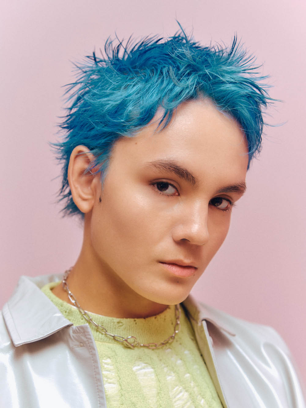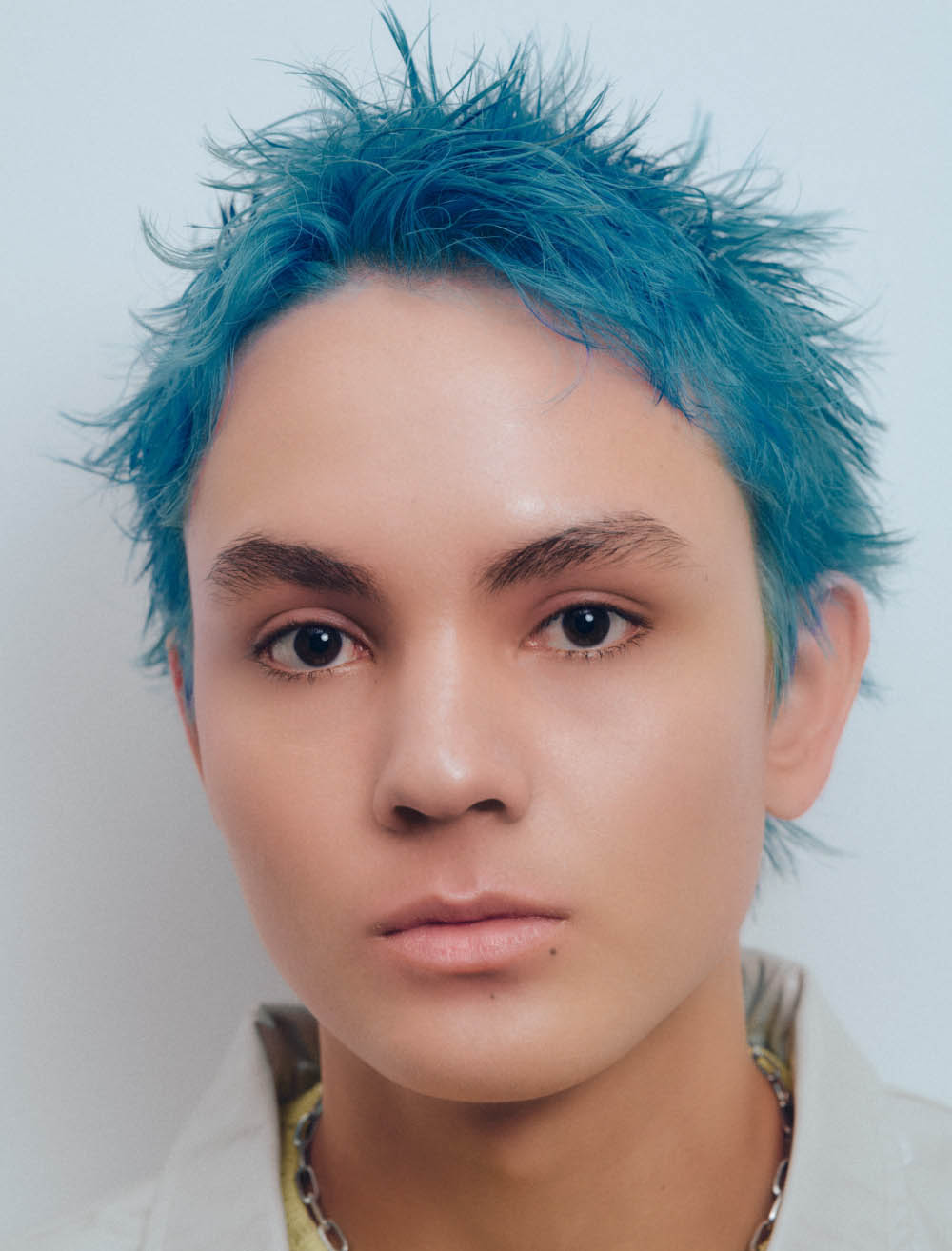 好きな色は、堂々と主張したい。街でも、パーティーでも、どこにいてもすぐにわかる、ストレートな個性が気持ちいい。だけど、ただの“やんちゃ”とあなどることなかれ。遊びを持たせたカットが物語るのは、ブルーの奥からにじみ出るひとくせの個性。