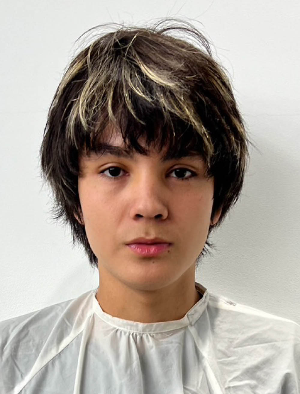 細毛・軟毛のショートヘア。毛先にポイントブリーチが残っている状態。