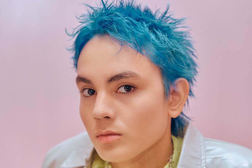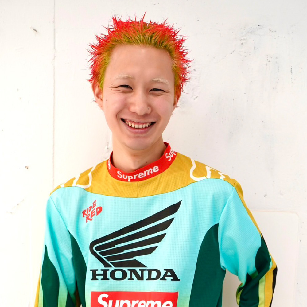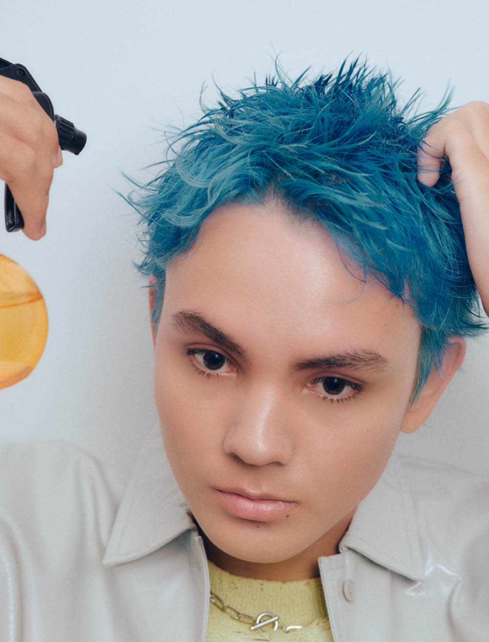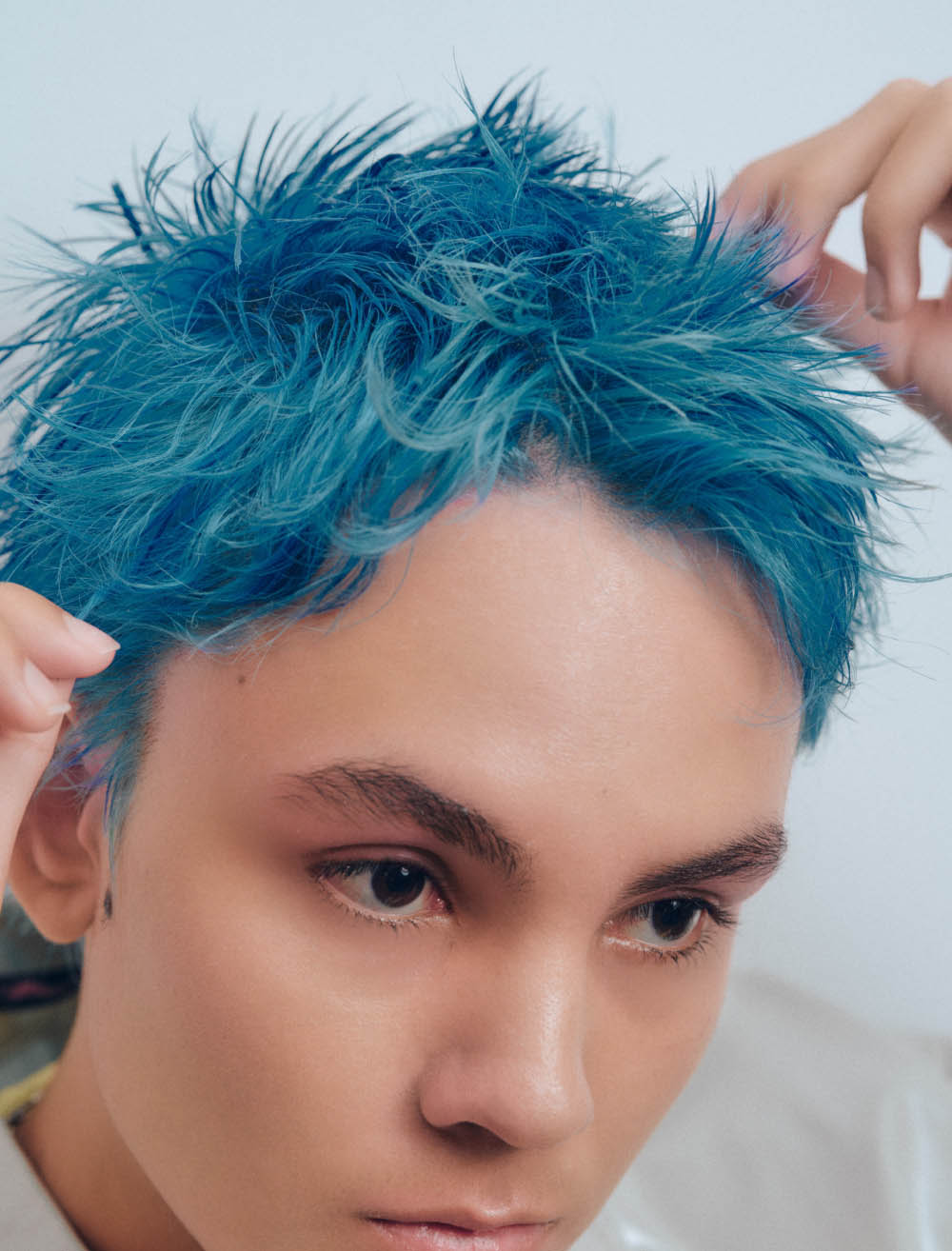 アジアンカラーフェスのシアンブルーがとにかくきれいな色なので、デザインカラーはもったいないと思い、色の鮮明さが際立つスタイルにしました。ブリーチ 120でしっかり明るくしてから、オンカラーはシアンの P9とP13をクリアで割って理想のトーンに調整。カットはあえて刈り上げず、もみあげや襟足に長短をつけておしゃれな遊びを利かせています!