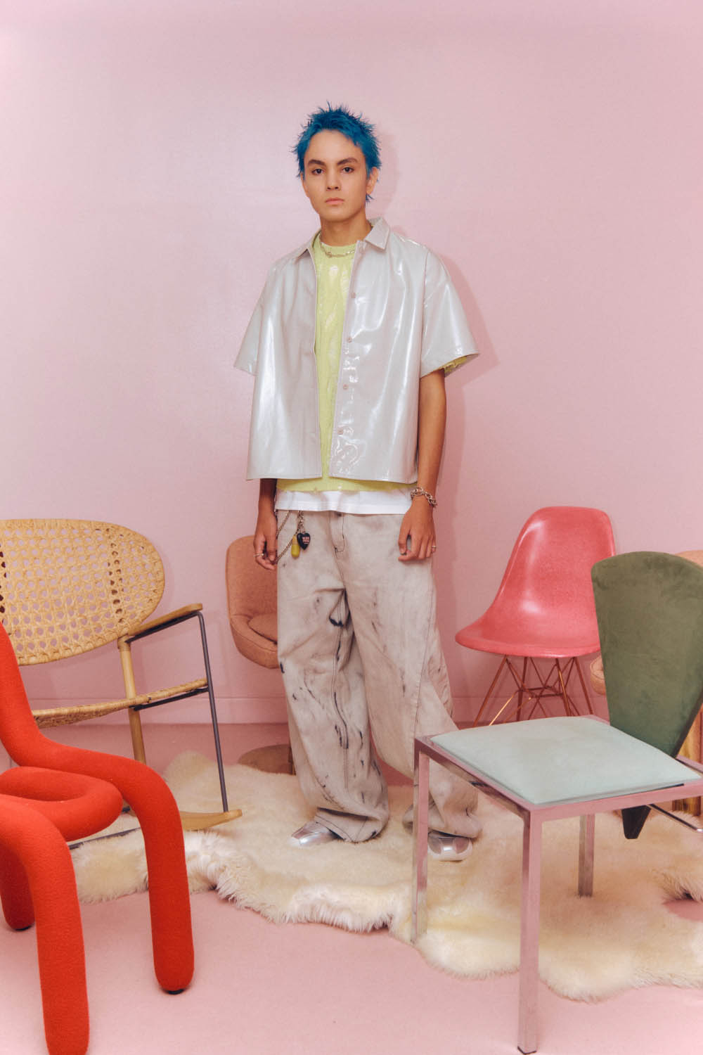ダメージ加工のあるニットトップ スに、ビニールレザーのジャケット、ケミカル加工のデニム、シルバーアクセサリーをコーディネート。インパクトのある髪色には、素材感の強いアイテムでバランスを取ることがポイント。全体の色数は押さえつつ、異なる素材感を組み合わせるこ とでセンスの良さも感じられる。