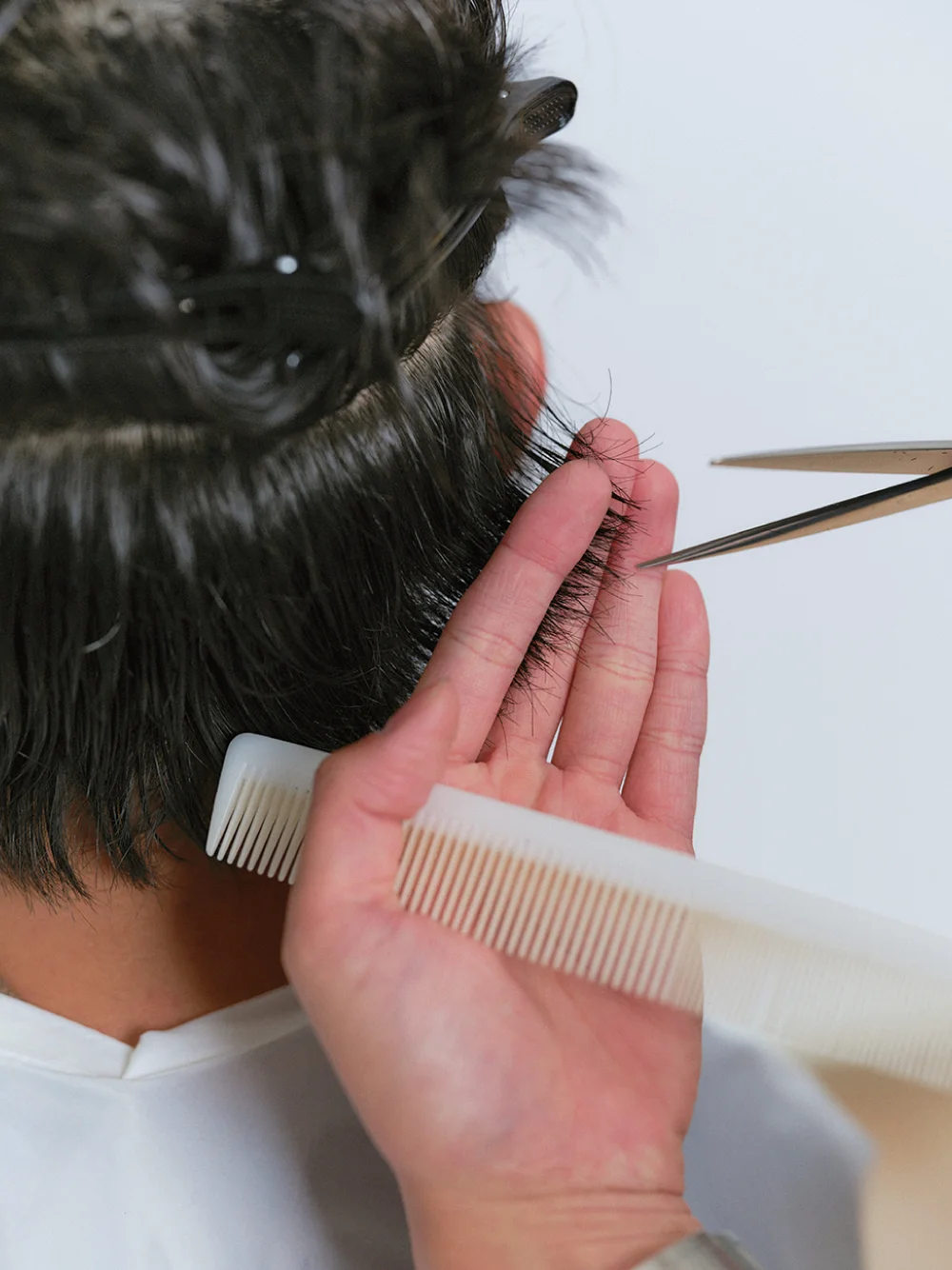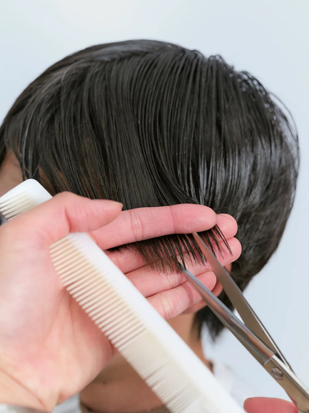 耳前をシザーで刈り上げ、後ろは長さが残るようにカット。