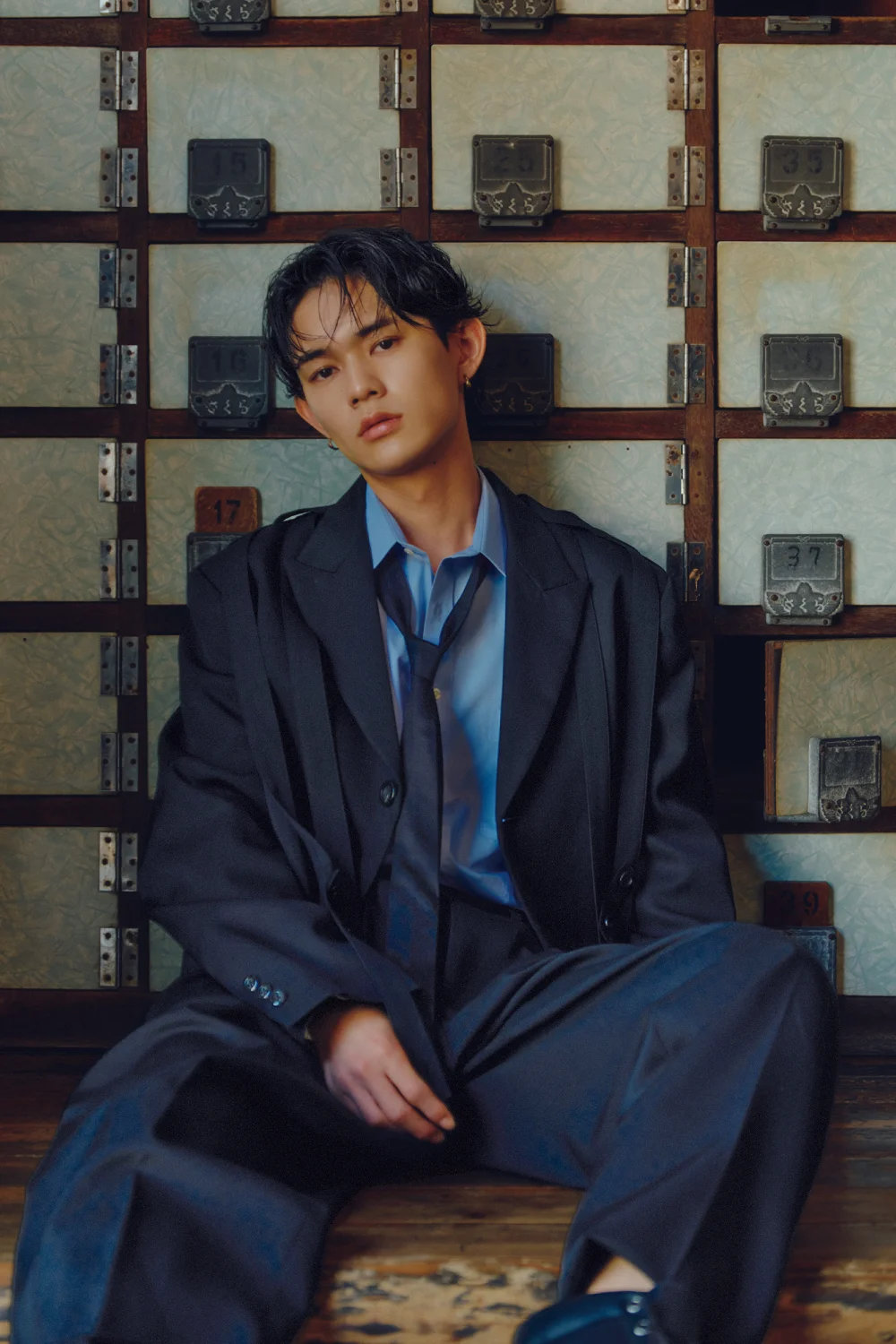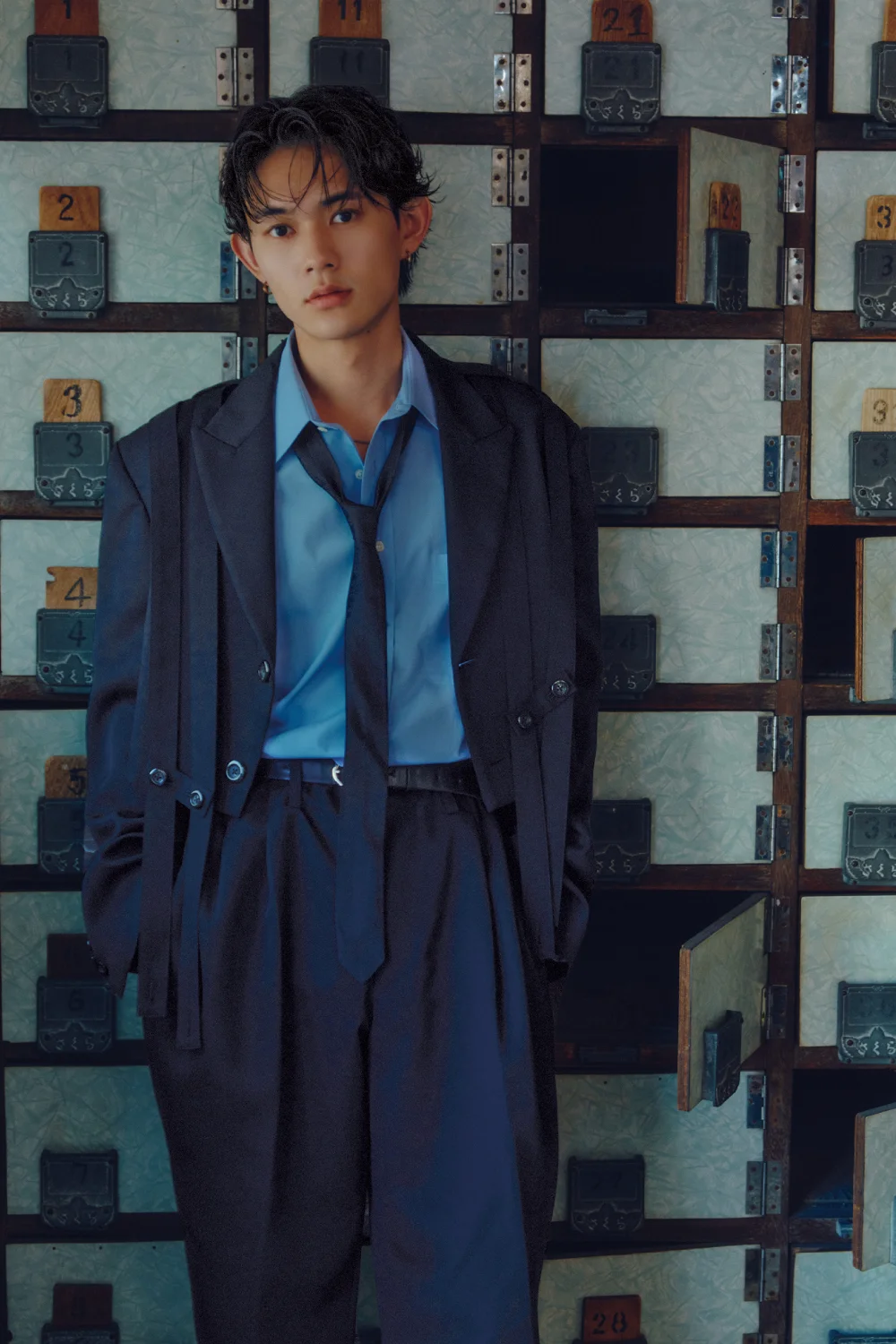肩幅がワイドなショート丈のジャケットに、テーパードのパンツを合わせ、重心を上に持たせたコーディネート。ルーズに結んだネクタイやシルバーのアクセサリーで、正統派アイテムの中に“外し”のエッセンスを