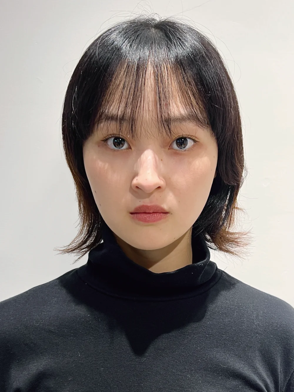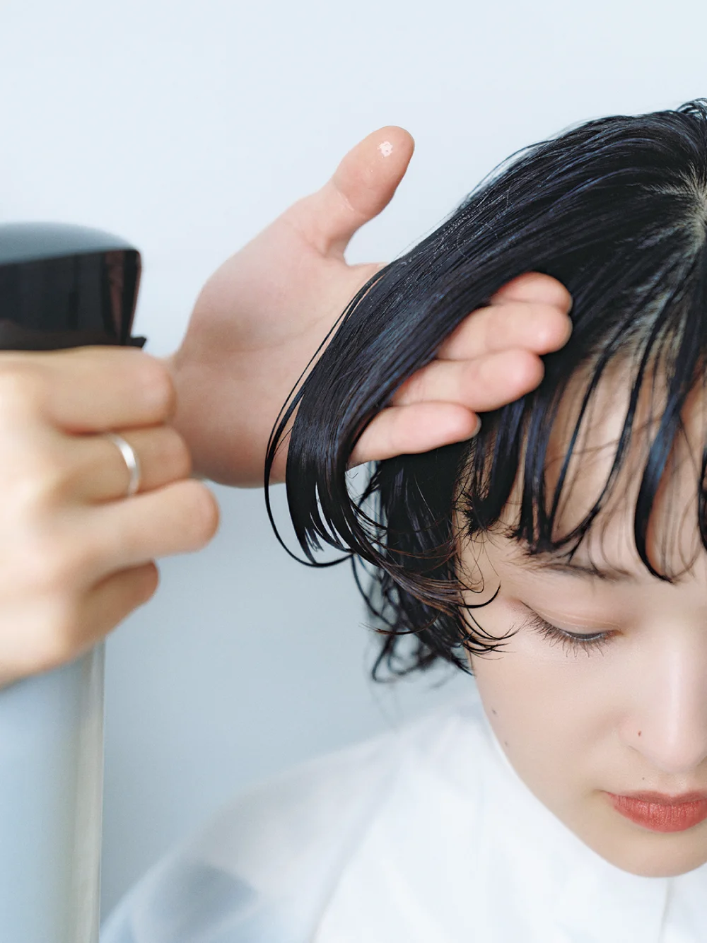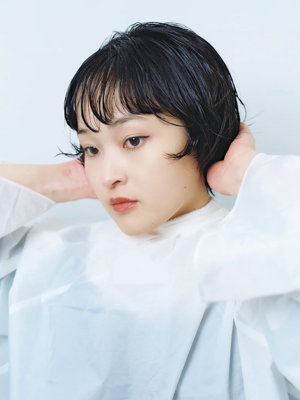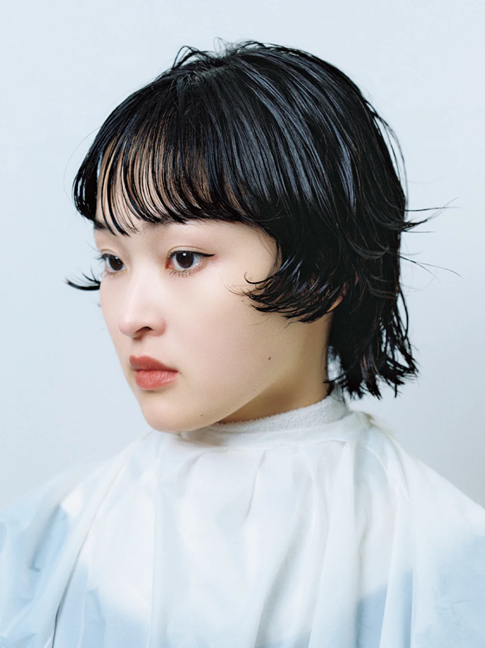 ワンレングスのサイドを頬骨ラインで切り込み、 Cカールで毛先を跳ね上げて横顔の美しさが際立つシルエットにデザインしました。ボリュームが出過ぎるとモード感が薄れてしまうので、 場所によってパーマの放置時間を変えてボリューム感をコントロール。エクラリティでケアしながらパーマをかけることで、 質感を損なわず 艶のある仕上がりになりました。