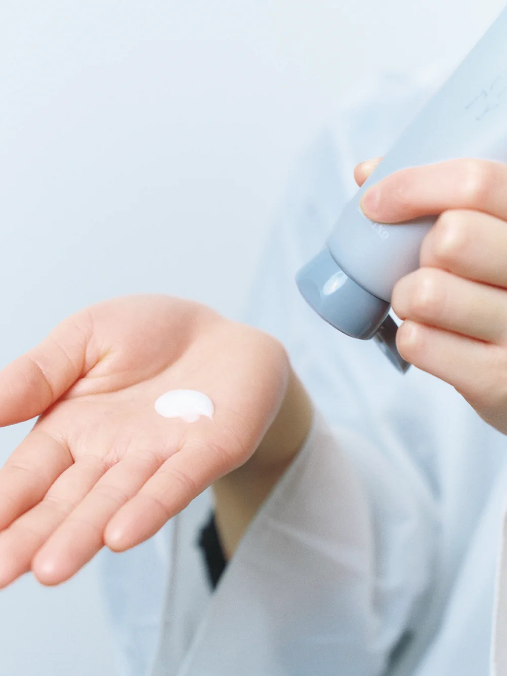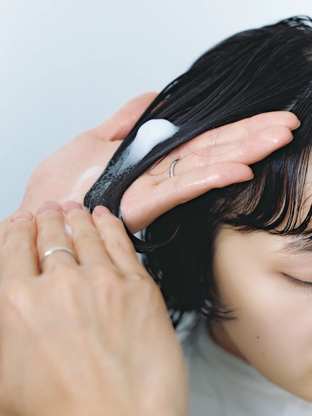 [エクラリティ STEP2] プレーンリンス後の髪にSTEP2:クレンズリペアフォームを塗布。 特にダメージをケアしたい中間~毛先に塗 布し、パーマ後のコンディションを整える。