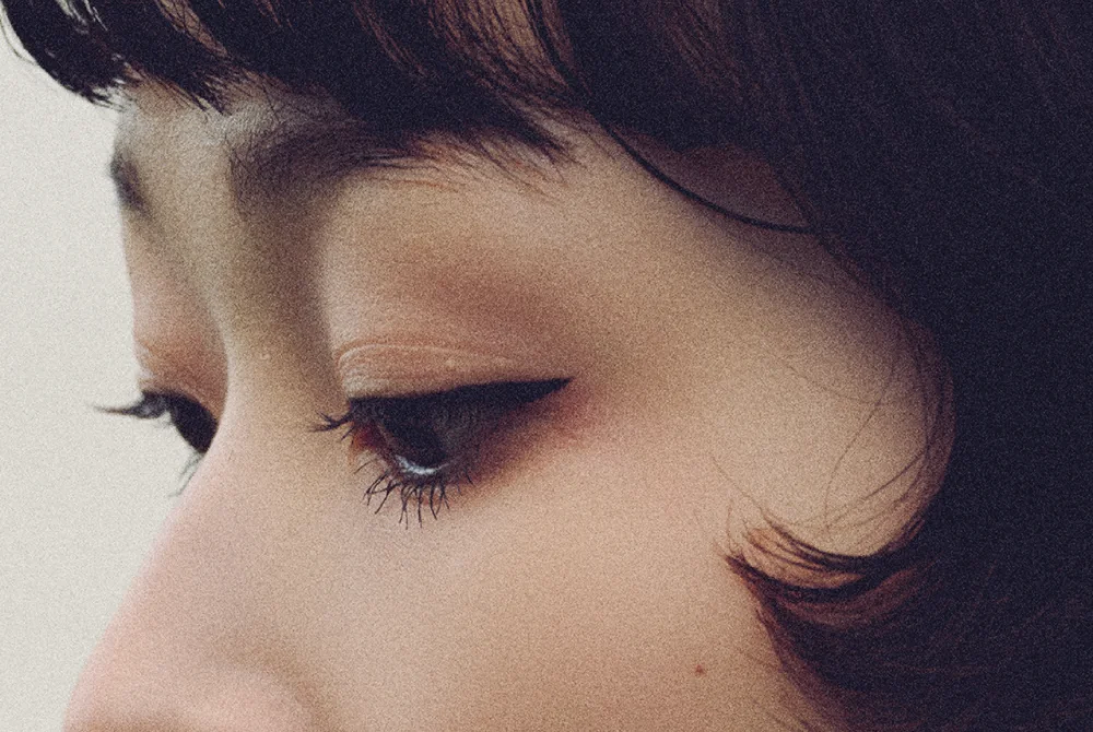 目頭から目の形に添ってアイラインを引き、横髪のカールに合わせて目尻を軽く跳ね上げる。マスカラは下まつ毛を重点的に塗り、黒目の下あたりに大粒のラメをオン。カラーレスでも印象的な目元に。