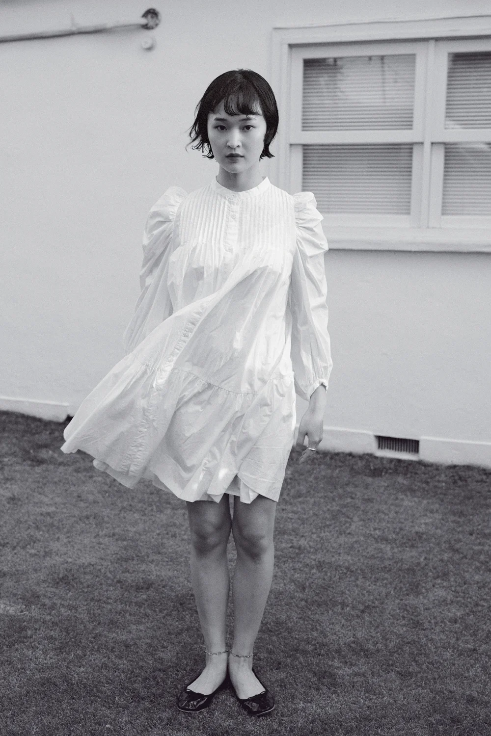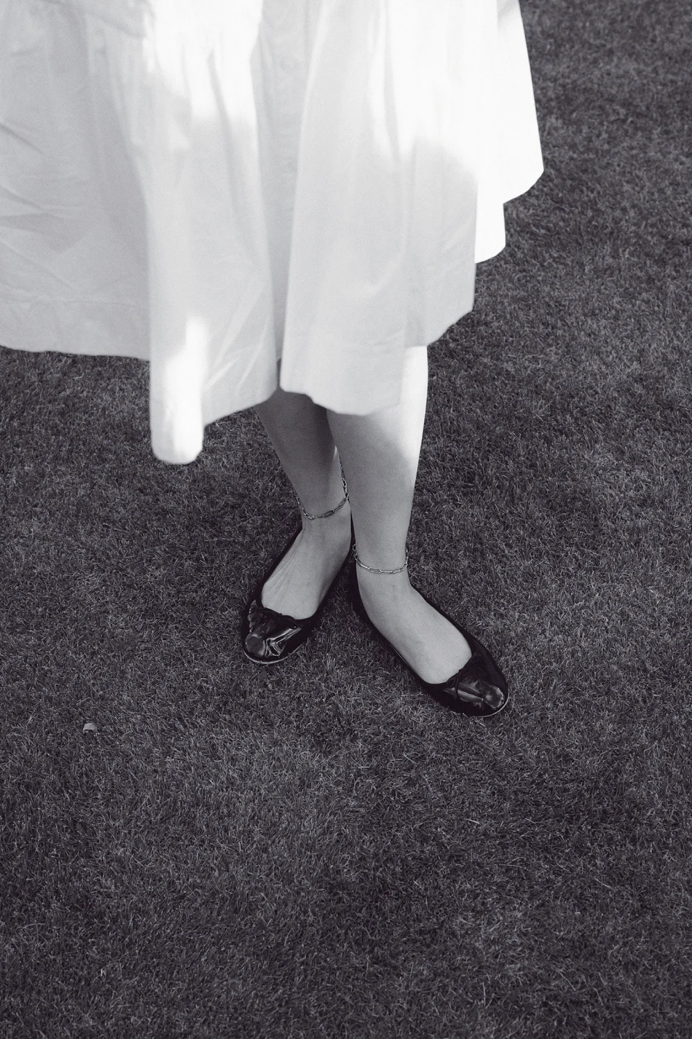 こだわりを感じるデザイン性の高いワンピースを主役に、足元はバレーシューズでシンプルにコーディネート。素足を飾るアンクレットが、 女性らしいドレッシーな雰囲気を一気に高める。