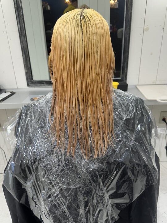半年前にインナーカラー、毛先は18Lvまで明るさがある状態だったので、中間→根元→シャンプー台で毛先残留が取れたらお流ししています。