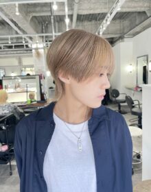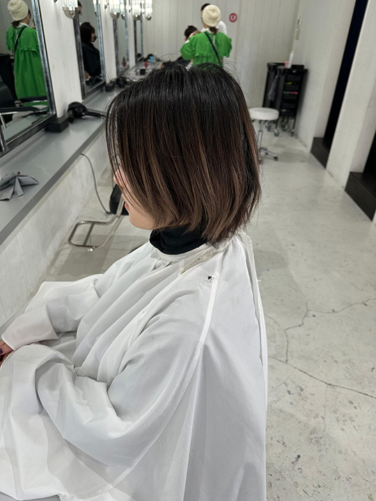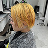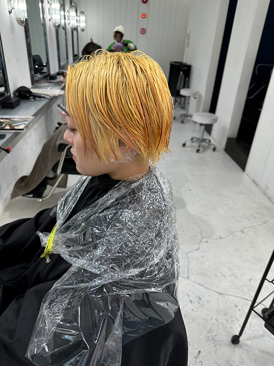 前回の履歴がネイビーで暗くしており、明るくしたいオーダーだったので全体ブリーチ、中間をホイルで包み、ブリーチ終わりオレンジみがあったので、青みで消しながらピンクの補色で緑にならないように表現しました。