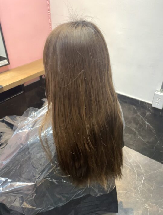 アクアとチャコールで赤みを消して、透け感の残る地毛風カラーです。
