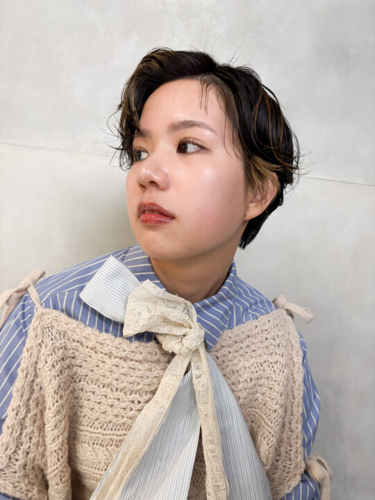 地毛ベースにポイントでブリーチしたデザインハイライトカラー。