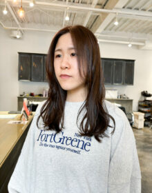 ブリーチありのオリーブグレージュ。暗めでも色味がちゃんと見える組み合わせで、透明感のあるカラーにしました。