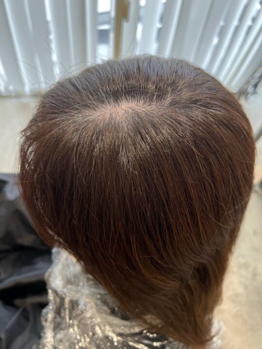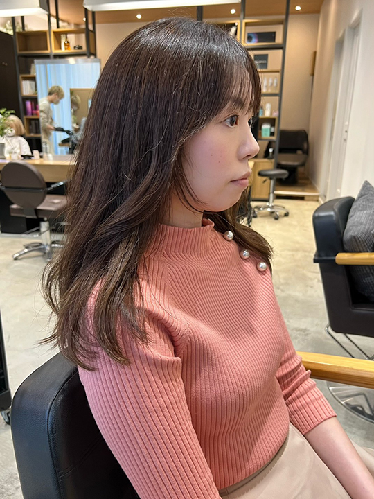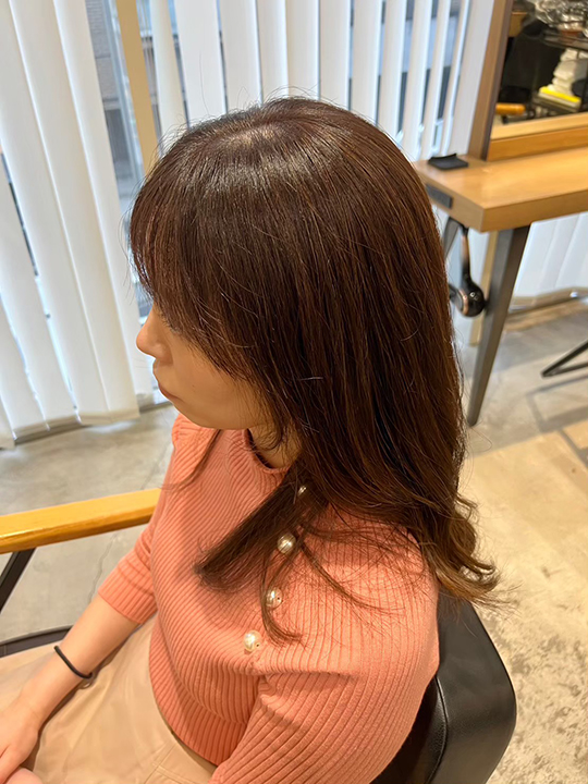 毛先はカラーの褪色がしやすく、オレンジ味が気になる髪質になので、色持ちを良くするようにV10Nをベースにオレンジ味を打ち出すashと柔らかなまろ味をだすpinkを組み合わせた透明感グレージュカラーにしました。