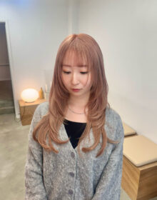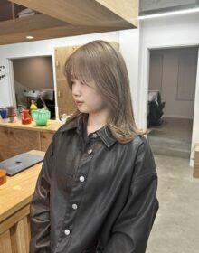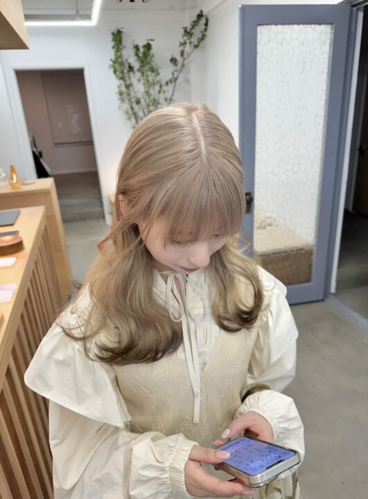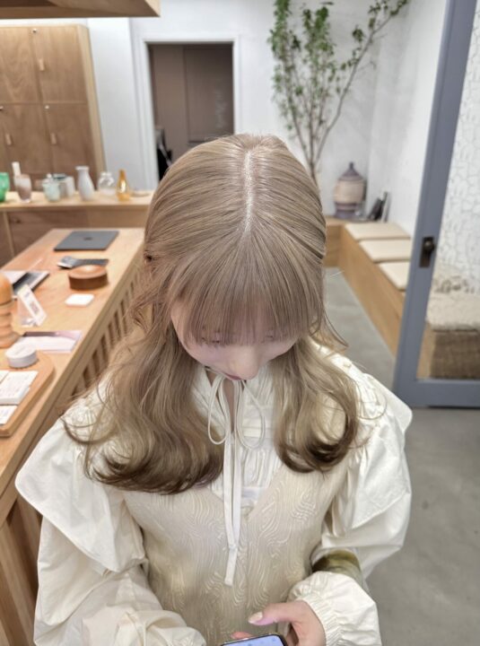 全体はミルクティーベージュのハイトーンに、毛先はブラウンの裾カラーのデザインカラー。
