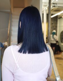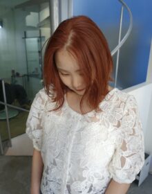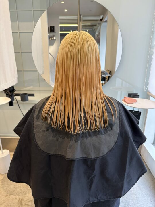 地毛からのブリーチだった為、カラー剤での塗り分けはせず、中間毛先の残留があるところからオンカラーし、時間差で根元を塗りました。