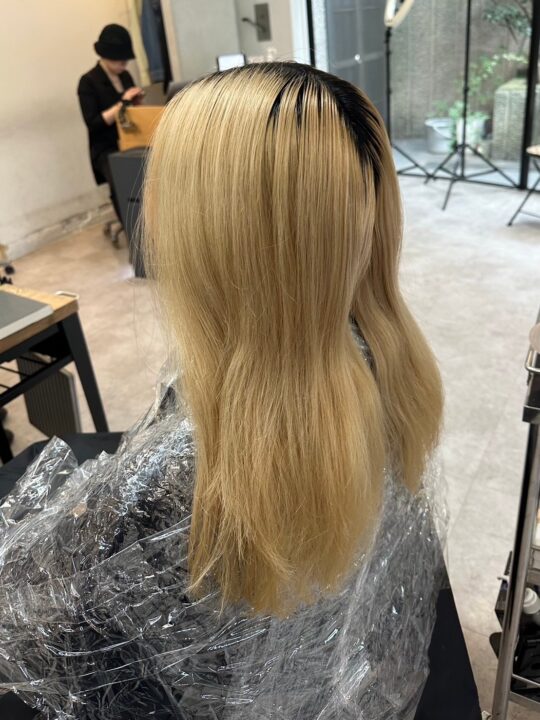 中間毛先の選定を少し濃くする事でシャンプーで流れた時の根元と毛先の彩度を調整しています。
