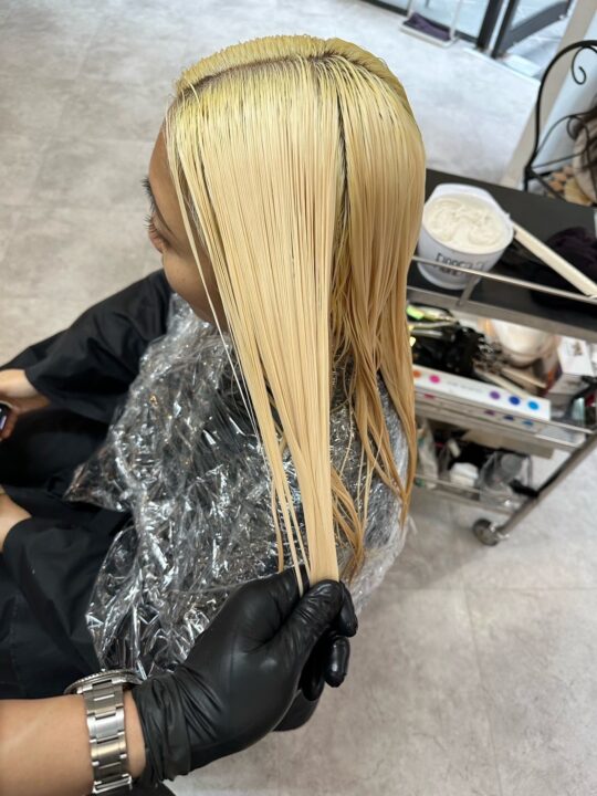 中間毛先の選定を少し濃くする事でシャンプーで流れた時の根元と毛先の彩度を調整しています