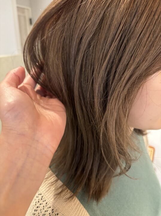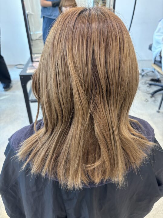 ワンブリーチで抜けていく段階を楽しめるように中明度で柔らかいミルクティーベージュに。