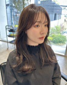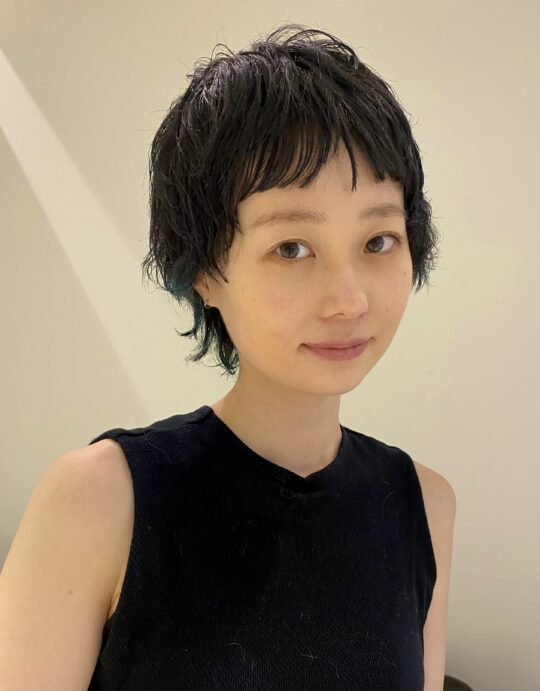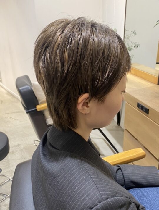 ダークトーンだけど重たくなりすぎない、柔らかさと深みのある印象を残した黒に近い低明度のモスグリーンと、襟足にはビビット過ぎないくすみ感のある高明度のモスグリーンを入れたデザインカラー。