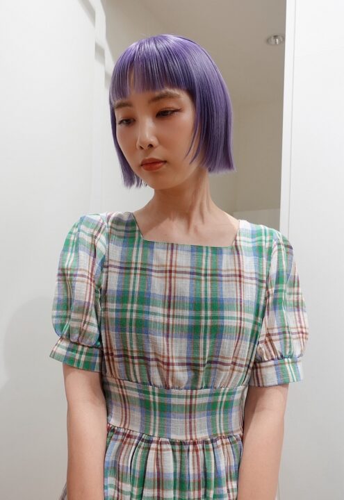 パツっとラインのあるボブに淡いペールラベンダーで柔らかい印象に。