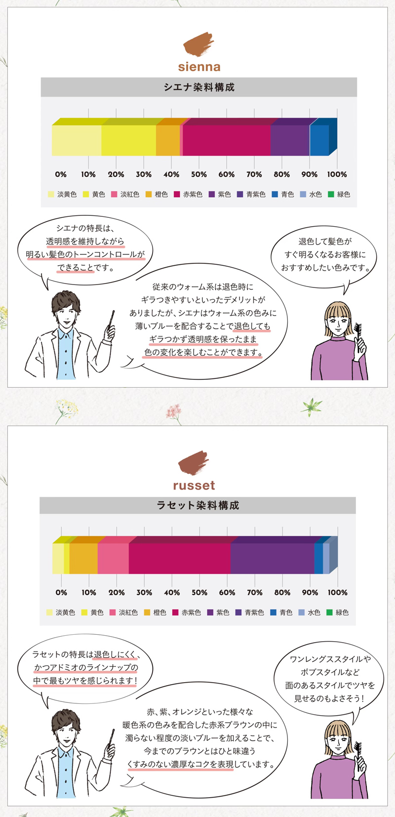 シエナの特長は、透明感を維持しながら明るい髪色のトーンコントロールができることです。