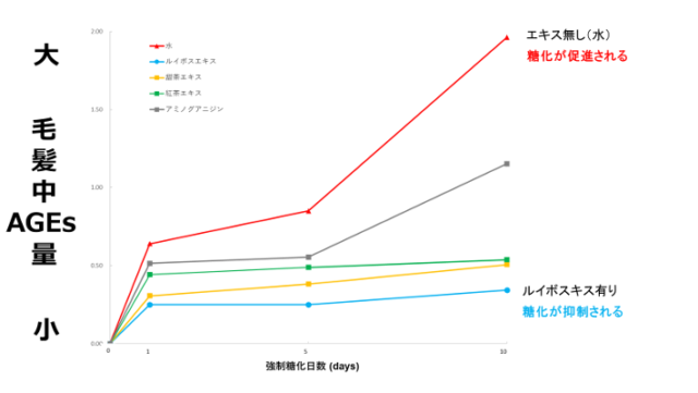 毛髪を強制的に糖化させ、ルイボスエキスの添加の有無で毛髪中のAGEs量と毛髪の強度を調べたところ、ルイボスエキスを添加することで毛髪の糖化が抑えられ、また糖化による毛髪強度の低下も抑制できる事がわかりました。