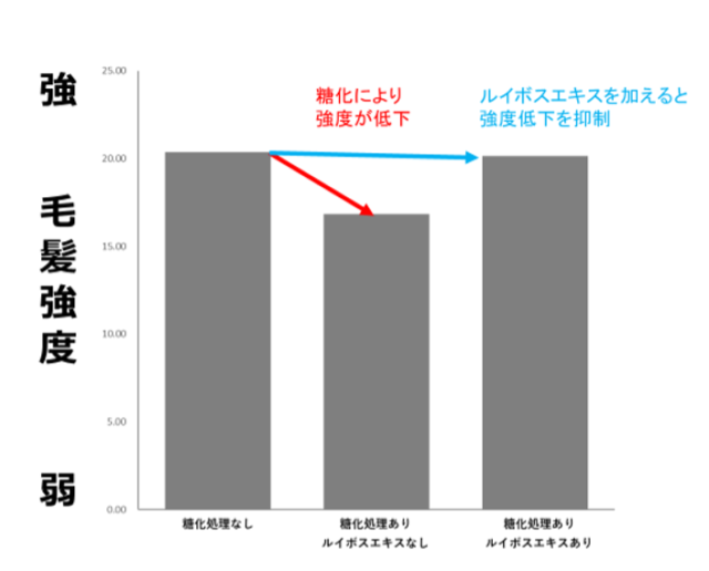 ルイボスエキスを用いることで、毛髪の糖化を防ぎ、また糖化による強度低下を抑制する事を確認した。