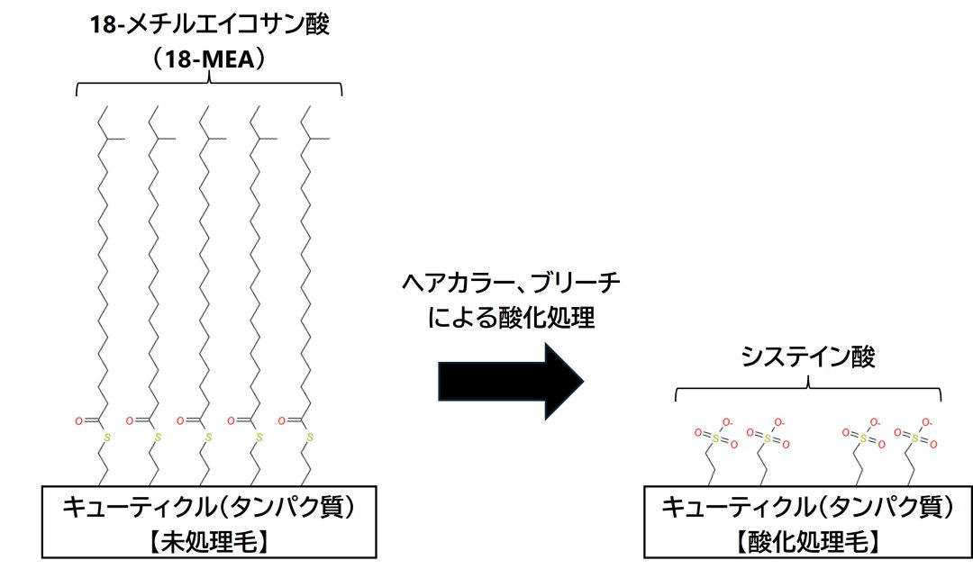 ヘアカラーやブリーチは、毛髪に明るさを与え多様なヘアデザインを実現する美容施術です。しかし同時に、酸化作用により毛髪周縁部キューティクルの剥離や、キューティクル最表面に結合している脂質である 18-メチルエイコサン酸(18-MEA)が失われてシステイン酸が生じる(図 1)など、酸化ダメージを引き起すことが知られています。これらの酸化ダメージにより、毛髪のツヤ感や手触りなどの質感低下につながるため、質感を向上させるためのトリートメント剤など様々なヘアケア製品の開発や、ヘアケア技術の研究が行われています。