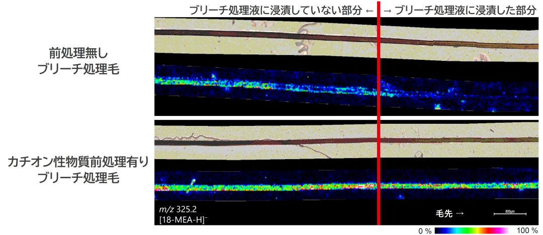 前処理無し、またはカチオン性物質の前処理有りの各条件でブリーチ処理した毛髪について、ナノ微粒子支援型レーザー脱離/イオン化(Nano-PALDI)質量分析法による 18-MEA のイメージング質量分析を実施した結果を図 3 に示します。
