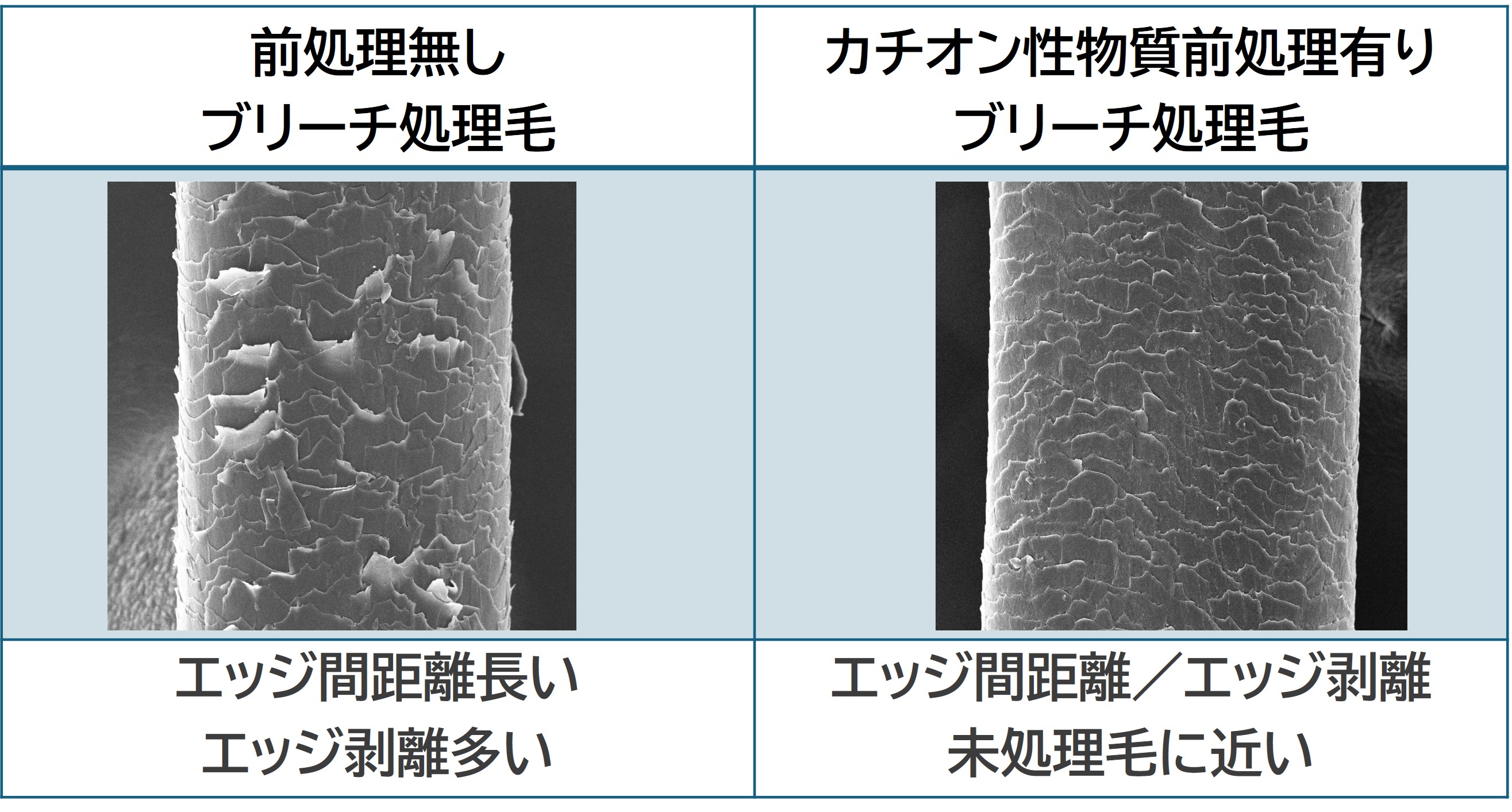 前処理無しブリーチ処理毛の結果から、キューティクルのエッジ間の距離が長く、エッジの剥離も多く生じていることが観察され、前処理無し条件ではキューティクルの剥離がかなり進行してしまうことが分かります。一方、カチオン性物質前処理有りブリーチ処理毛の結果では、エッジ間距離およびエッジ剥離の状態は未処理毛と近い状態であることが示されました。
