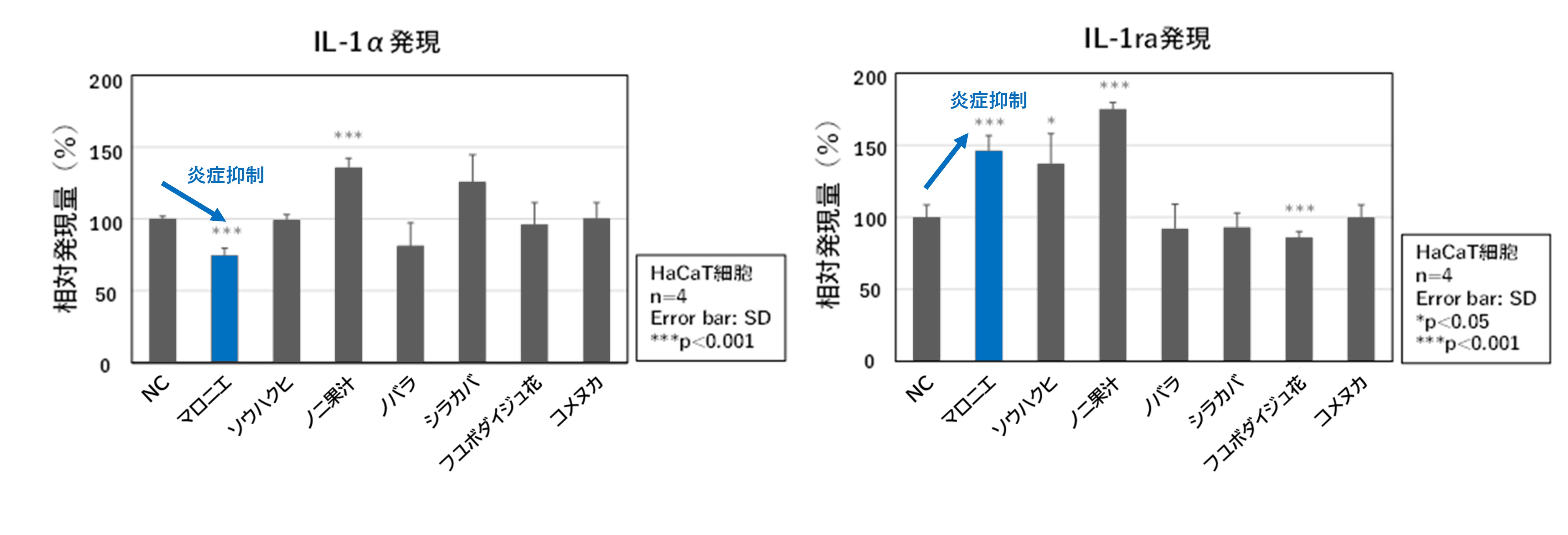 図1. 表皮角化細胞のIL-1αおよびIL-1ra発現に与える各種植物エキスの影響