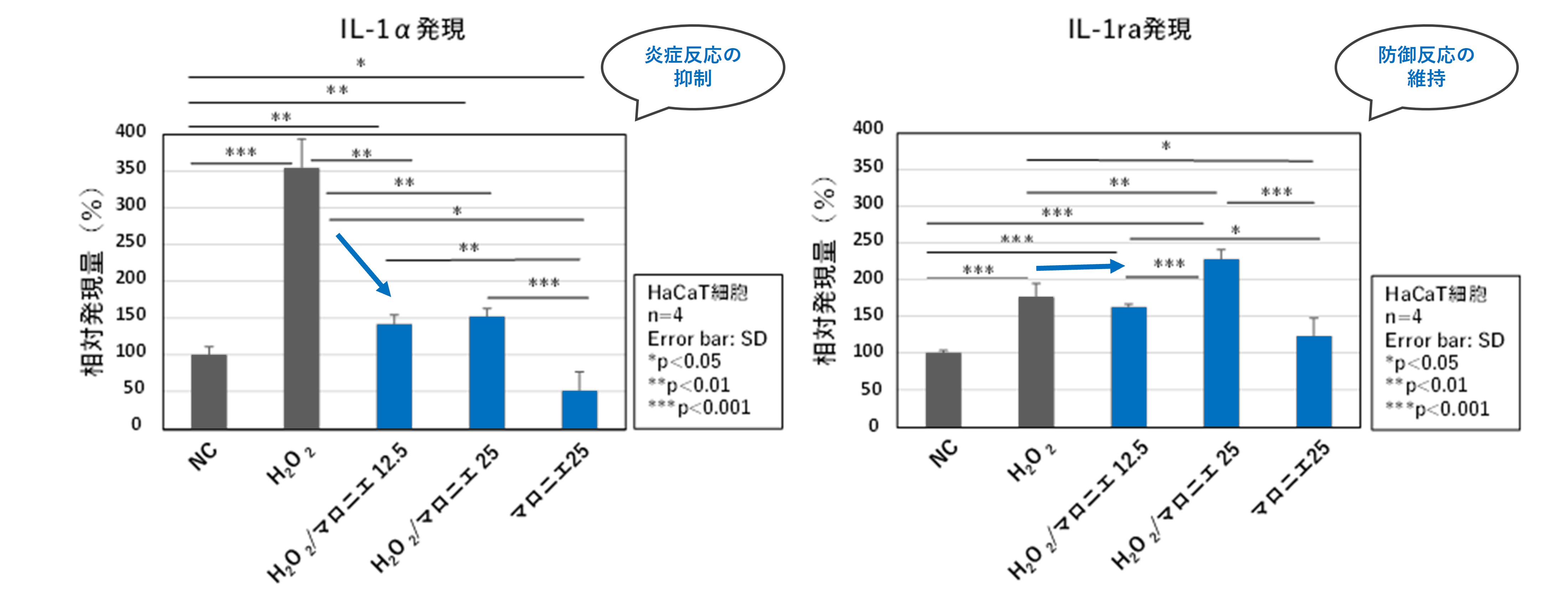 図2. 酸化ストレスモデルにおけるIL-1αおよびIL-1ra発現に与えるマロニエエキスの影響