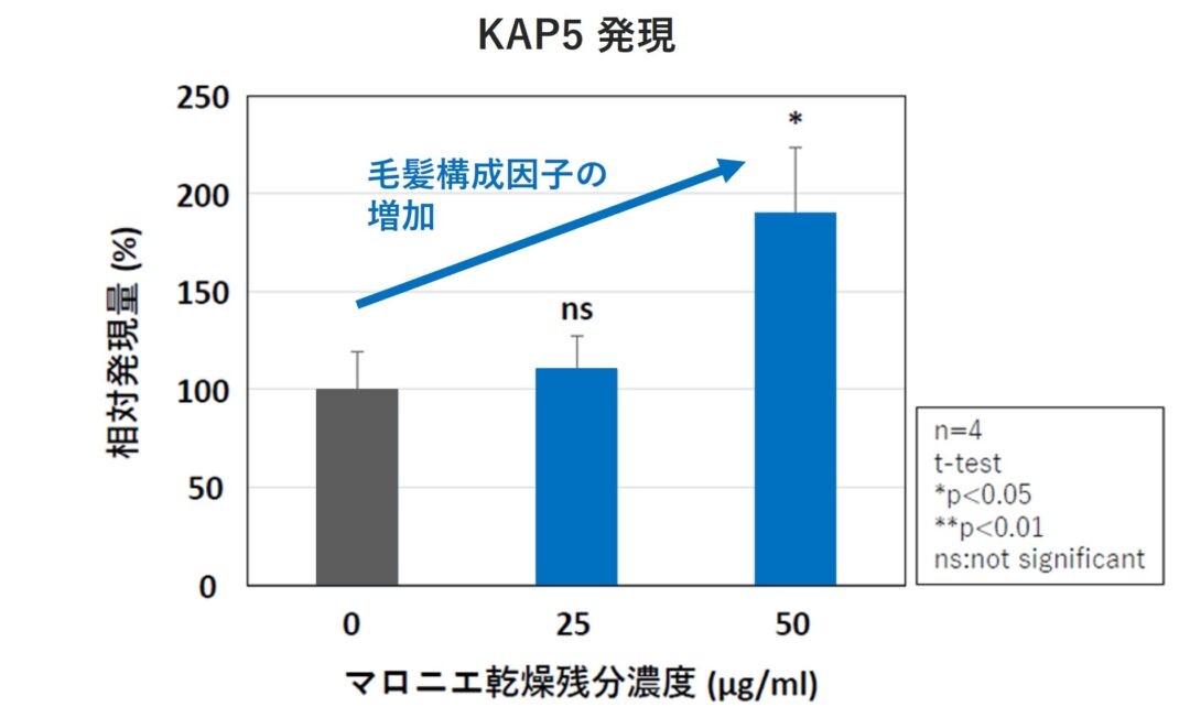 追加検討として、外毛根鞘細胞を用いた評価を行った結果、マロニエエキスはキューティクル形成に関わる遺伝子である KAP5 の発現を有意に亢進しました。