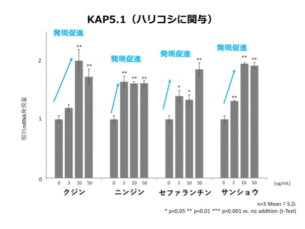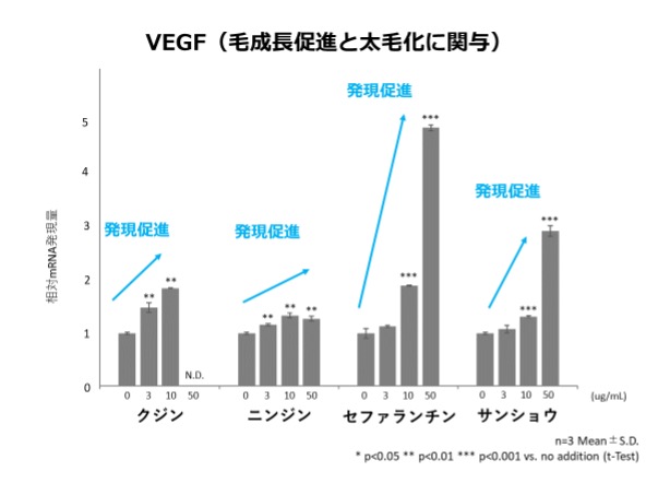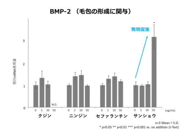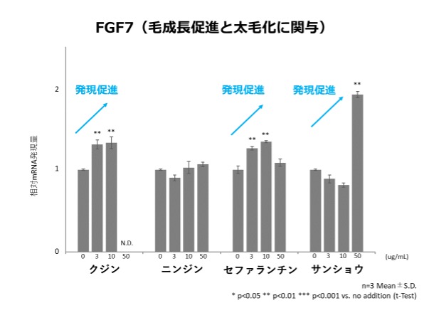 試験の結果、クジンエキス、ニンジンエキス、セファランチンには毛成長促進と太毛化・ハリコシに関与、サンショウエキスには上記に加え毛包を形成する遺伝子の発現促進効果が確認されました。
