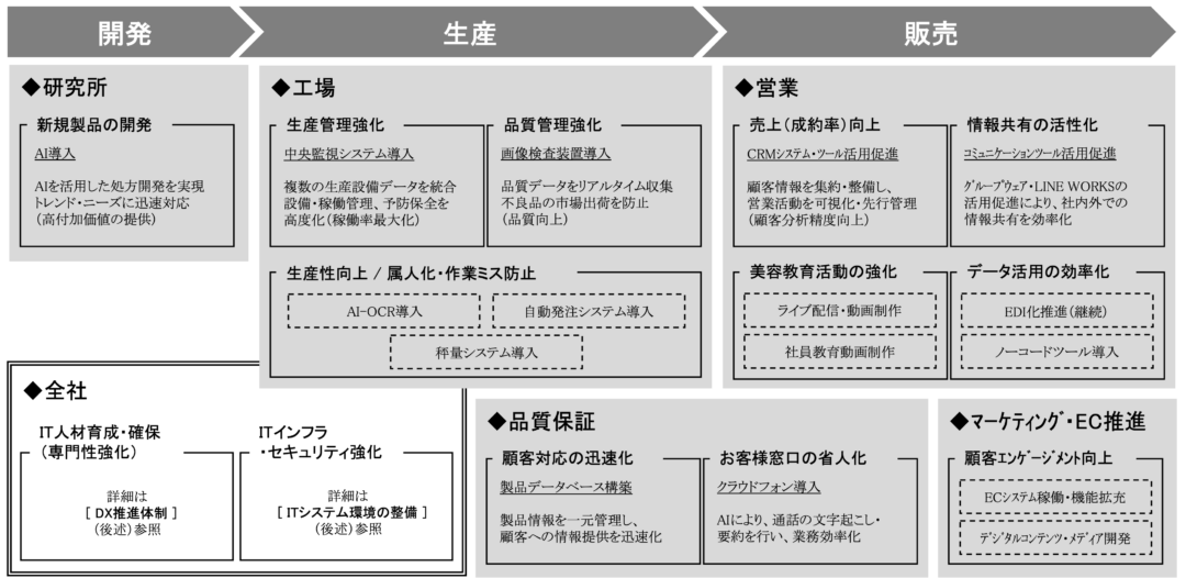 当社では、前中期経営計画(2022~2024年度)以降、全社的なDX強化施策を明確化し、実行計画の策定と進捗管理を行っております。