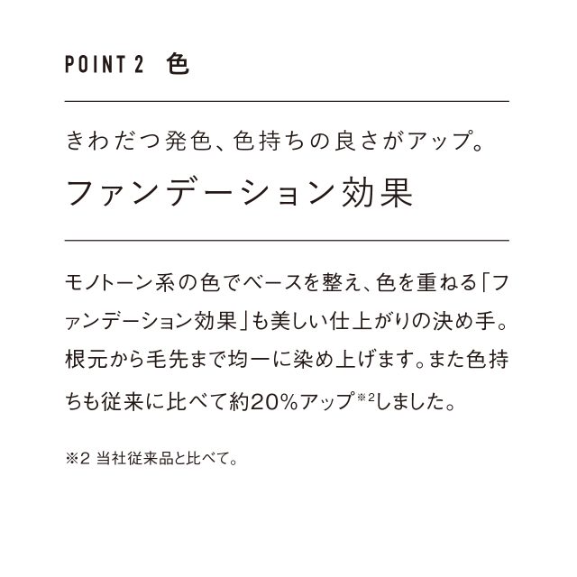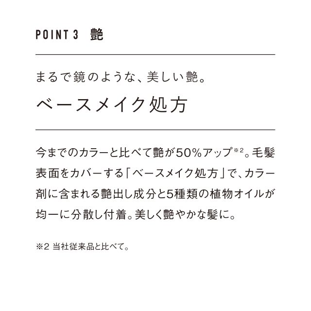 ダメージに配慮しつつ、魅力的な色と艶を表現する抗酸化安定処方※のヘアカラー。(※酸化に注目した、毛髪内部での効果的な発色を促す処方)