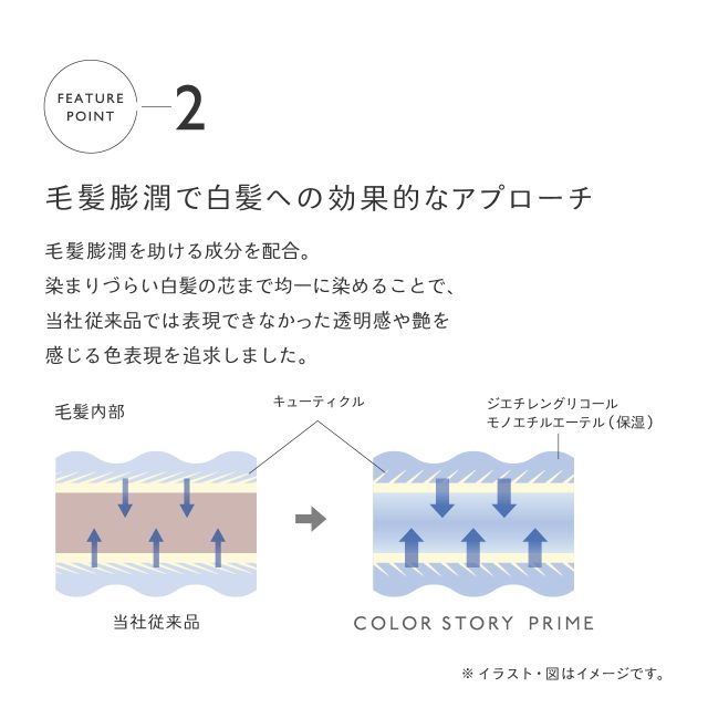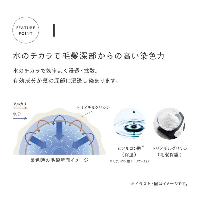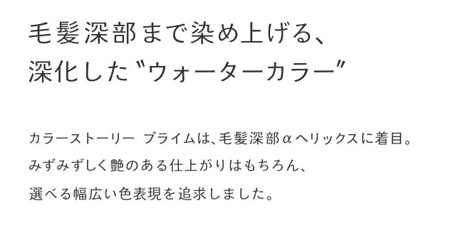 白髪のある髪に特化し、様々な価値観のお客様に細やかに対応する色みを揃え、水のチカラで毛髪深部まで染め上げます。